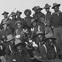 This group of African American soldiers was photographed at Camp Wikoff, New York, in 1898. At the end of the Spanish-American War, soldiers returning from Cuba or Puerto Rico were stationed here to make sure they had not contracted any communicable diseases like yellow fever or malaria. Once they were medically cleared, the men were discharged.