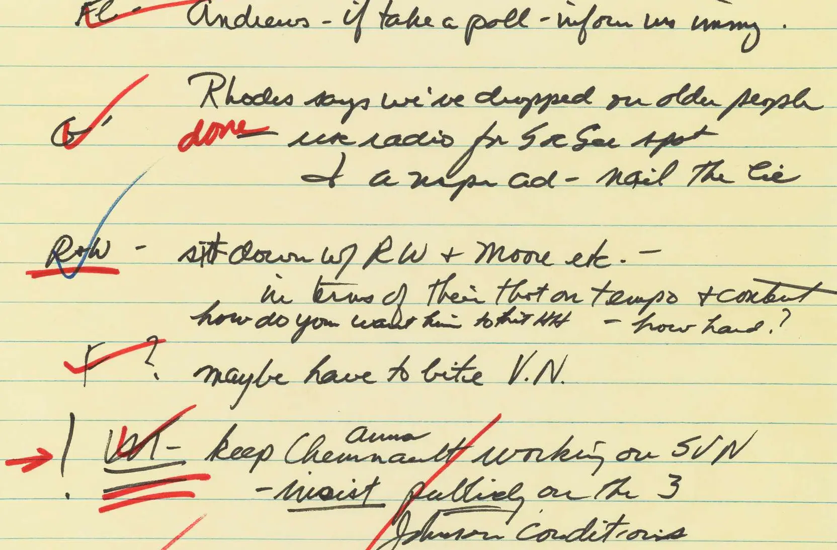 G’ [in red: done] Rhodes [John Rhodes, House Minority Leader] says we’ve dropped on older people – use radio for Soc Sec spot & a nspr [newspaper] ad – nail the lie