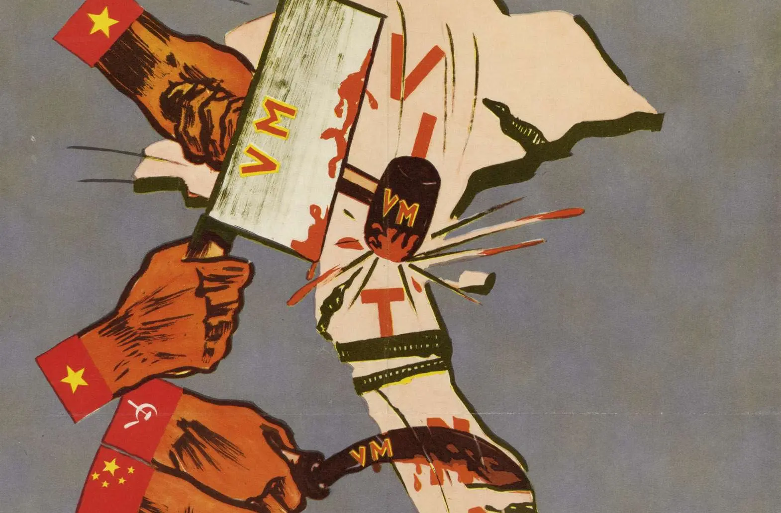 Depicted is an attack on the Associated State of Vietnam (South Vietnam) by communist forces from the People’s Republic of China, the Soviet Union, and the Democratic Republic of Vietnam (North Vietnam). Each hand is depicted with a flag from these nations as they use a hammer and sickle to assault the State.