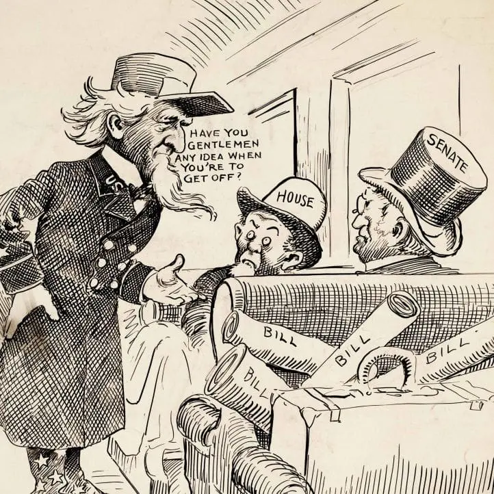 This cartoon concerns when Congress planned to adjourn. The second session of the 62nd Congress began on December 4, 1911, and as the 1912 election neared, there was no end in sight. This cartoon has Uncle Sam dressed as a train conductor asking the House and Senate when they will adjourn so members can return home to campaign. Congress remained in session for another month after this cartoon was published.