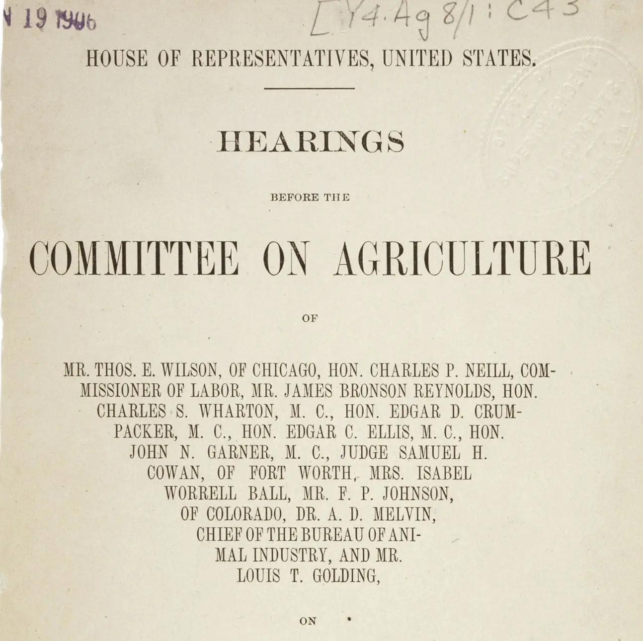 In an effort to regulate the national food supply, the House Agriculture Committee held hearings in the spring and summer of 1906 on the Pure Food and Drug Act and the Meat Inspection Act.