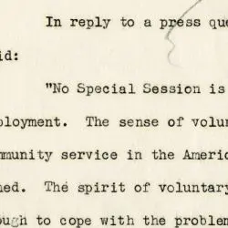 Full Citation: Herbert Hoover’s Response to a Question by the Press; 10/24/1930; Unemployment-PECE- Correspondence, October 1-25, 1930; President’s Subject Files, 1929 – 1935; Collection HH-HOOVH: Herbert Hoover Papers,; Herbert Hoover Library, West Branch, IA. [Online Version, https://docsteach.org/document/herbert-hoovers-response-question-press/, April 6, 2026]