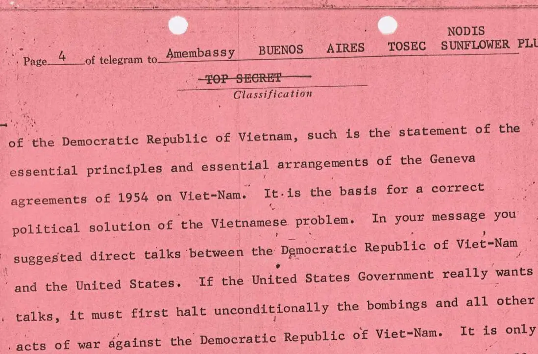 President Johnson proposed peace talks to end the Vietnam War in February 1967. Although Ho Chi Minh had tried to initiate negotiations with the United States through third parties, he was constrained by official party policy. He wrote to President Johnson, in French, regarding the peace negotiations, and his response reflects that policy: “The Vietnamese people will never give way to force, it will never accept conversation under the clear threat of bombs.”