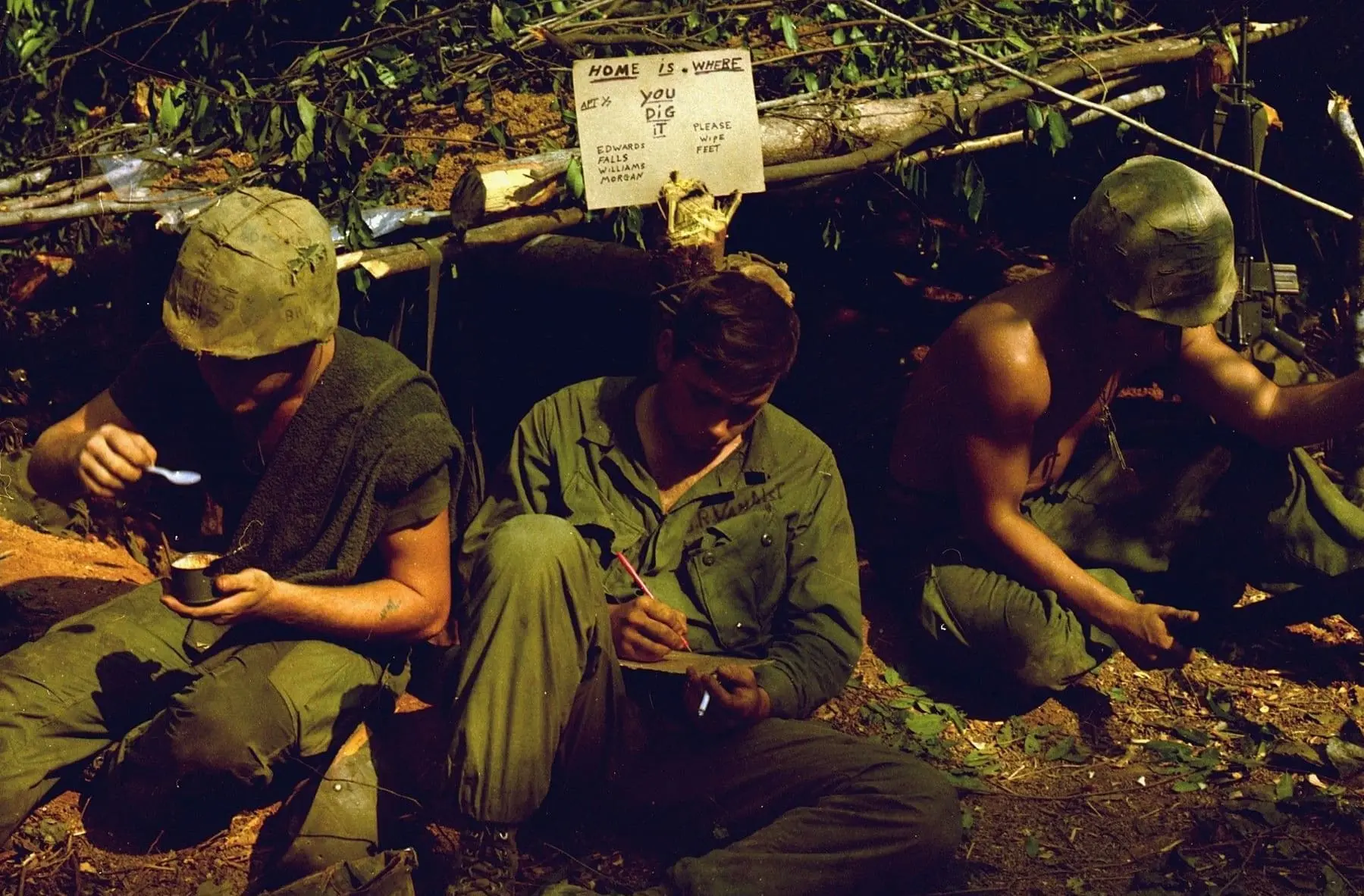 The original caption for this photograph reads: Vietnam….”Home is where you dig” was the sign over the fighting bunker of Private First Class Edward, Private First Class Falls and Private First Class Morgan of the 1st Battalion, 7th Regiment, during Operation Worth.