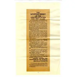 Full Citation: Leaflet titled ‘The Hypocrisy of the United States and Her Allies’; 8/1918; C15-22, U.S. District Court for the Southern District of New York; United States of America v Jacob Abrams, Jacob Schwartz, Samuel Lipman, Hyman Rozansky, Hyman Lachowsky and Molly Steimer, etc.; Criminal Case Files, 1845 – 1979 (NAI #582173); Records of District Courts of the United States, Record Group 21; National Archives at New York, New York, NY. [Online Version, https://docsteach.org/document/hypocrisy-us-allies/, December 2, 2025]