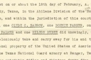 This is an indictment from a Dallas criminal case file for Bonnie Parker and Clyde Barrow, aka Bonnie and Clyde, and four others, resulting from them stealing four Browning automatic rifles and thirteen Colt automatic pistols from the Texas National Guard armory at Ranger, TX, on February 19, 1934. The indictment against the six defendants was filed in May 1934 in the U.S. District Court for the Northern District of Texas, Dallas Division. The arrest warrants were returned to the court on July 16, 1934, with notations “defendant not found in district.”