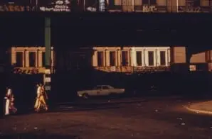 Original caption states: “Inner city residents of Brooklyn in New York City walk along Bushwick Avenue oblivious to the noise of the graffiti garbed elevated train. The inner city today is an absolute contradiction to the main stream America of gas stations, expressways, shopping centers and tract homes. It is populated by Blacks, Latins and the White poor.”