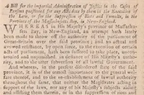 - The Administration of Justice Act, which asserted that trials against officials of the Crown were to take place in Great Britain and not in Massachusetts if the Crown believed Massachusetts incapable of executing a fair trial