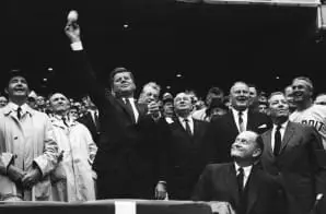 This photograph shows President John F. Kennedy throwing out the first pitch on Opening Day in 1962 at a game between the Washington Senators and the Detroit Tigers at the new D.C. Stadium.