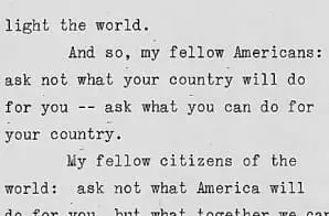 The climax of the speech and its most memorable phrase – “Ask not what your country can do for you – ask what you can do for your country” – was honed down from a thought about sacrifice that Kennedy had long held in his mind and had expressed in various ways in campaign speeches.