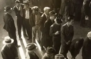 This image was captured by photographer Dorothea Lange during the Great Depression. The original caption reads: Jobless Men Lined up for the First Time in California to File Claims for Unemployment Compensation.