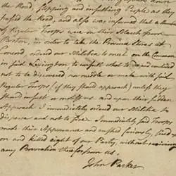 I John Parker, of lawful Age, and Commander of the Militia in Lexington, do testify & declare that on the 19th Instant, in the morning, about one of the Clock, being informed that there were a Number of Regular Officers riding up and down the Road, Stopping and insulting People as they passed the Road, and also was informed that a Number of Regular Troops were on their March from Boston, in order to take the Province Stores at Concord, ordered our Militia to meet on the Common in said Lexington, to consult what to do, and concluded not to be discovered nor meddle or make with said Regular Troops (if they should approach) unless they should insult or molest us – and upon their sudden Approach I immediately ordered our Militia to disperse and not to fire – Immediately said Troops made their Appearance and rushed furiously, fired up-on and killed eight of our Party, without receiving any Provocation therefor from us,