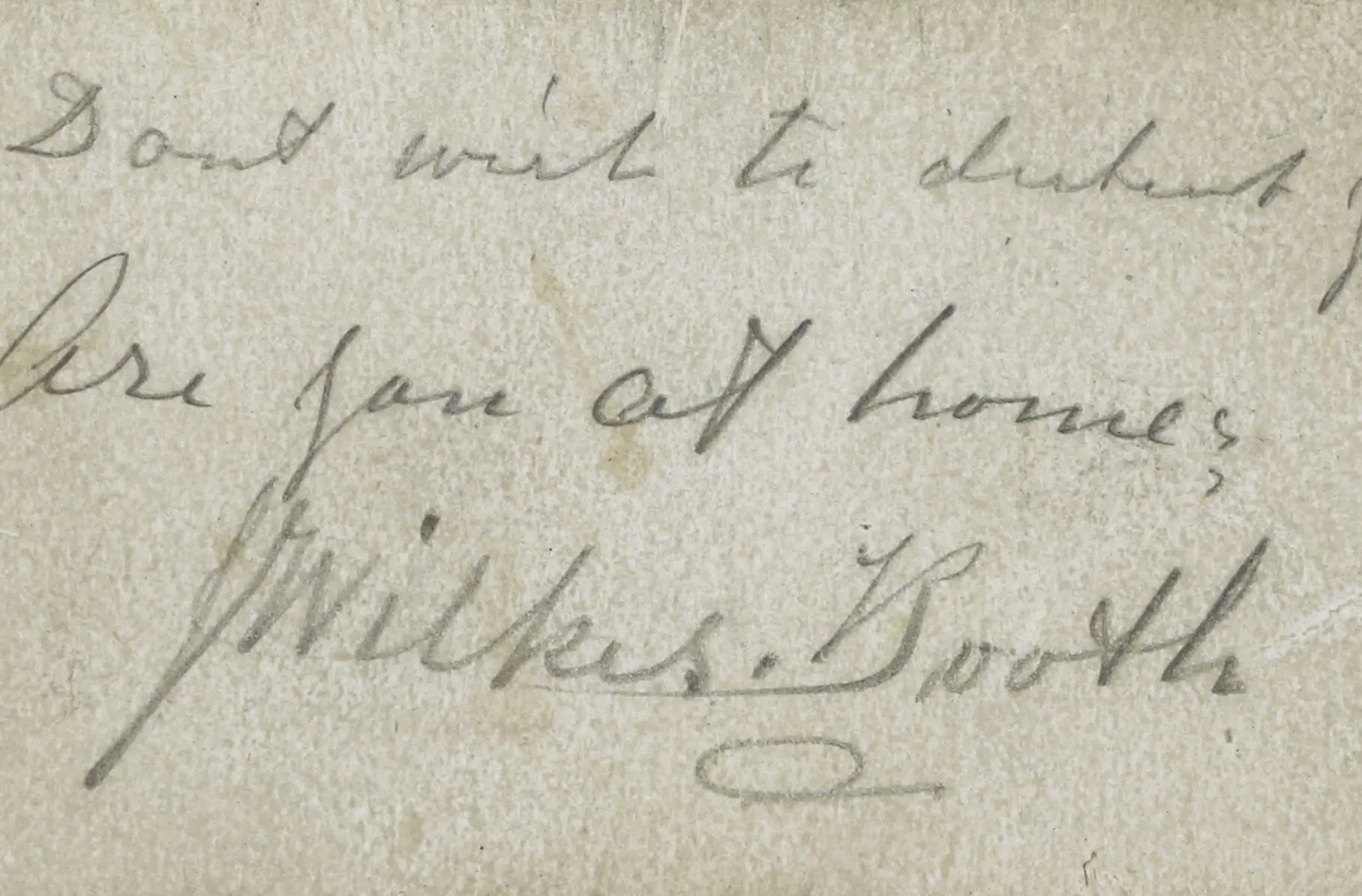 This small calling card was handwritten by John Wilkes Booth and left for Vice President Andrew Johnson at his Washington, DC, hotel. The card reads: “Don’t wish to disturb you. Are you at home? J. Wilkes Booth.”