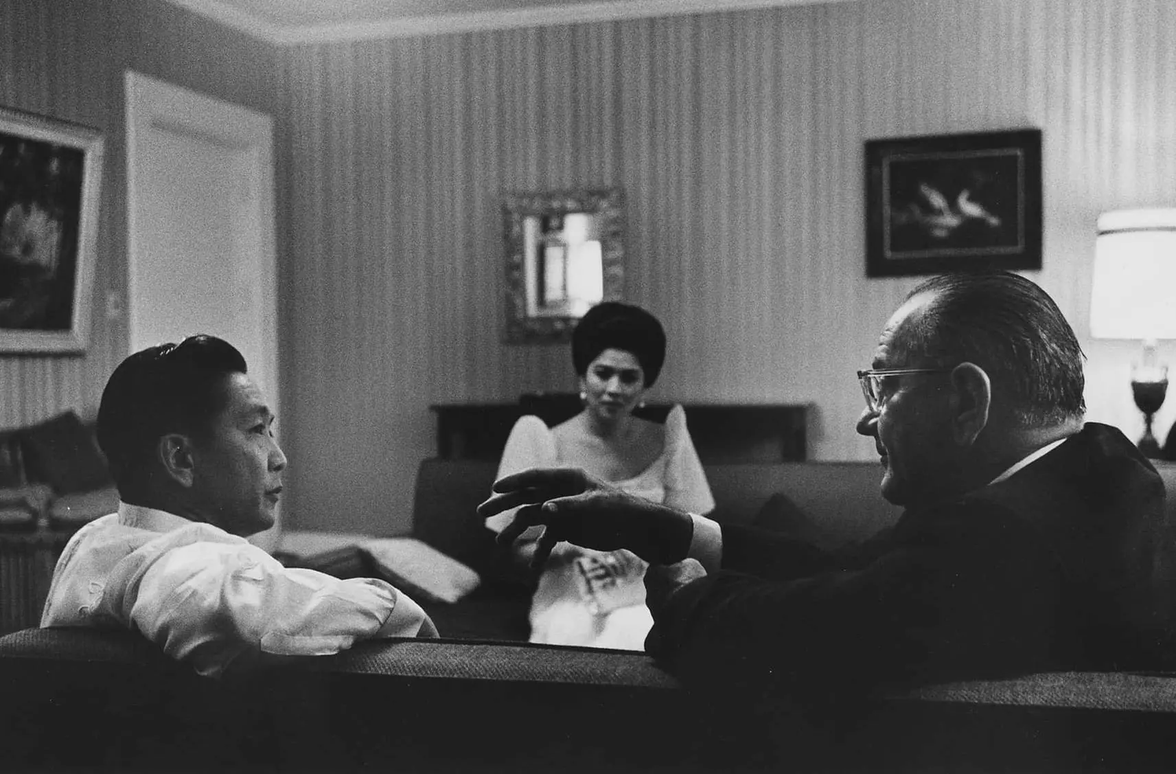 President Lyndon B. Johnson participated in the 1966 SEATO (Southeast Asia Treaty Organization) conference in Manila, Philippines. This photograph shows, left to right: President of the Philippines Ferdinand Marcos, Imelda Marcos, and President Johnson.