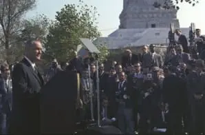 This photograph shows President Lyndon Baines Johnson speaking at the signing ceremony for the Immigration Act of 1965.