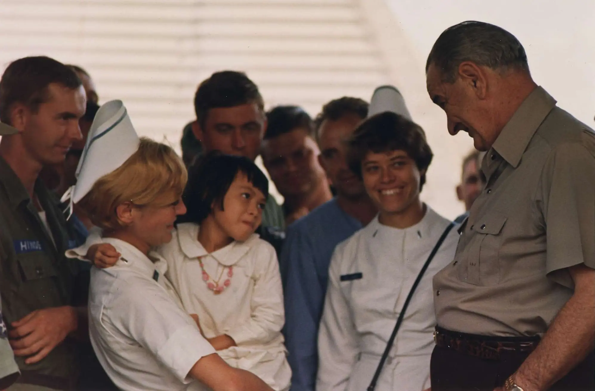 In December 1967, President Lyndon B. Johnson paid a surprise visit to South Vietnam to raise troop morale, the second of two visits by President Johnson to U.S. troops in Vietnam during the Vietnam War. In this photograph the President poses with nurses at a military hospital in Cam Rahn Bay, Vietnam.