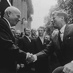 Full Citation: Khrushchev and Kennedy Shaking Hands; 6/3/1961 – 6/4/1961; Look Magazine Photographs, January 1, 1946–December 31, 1963; Collection JFK-LOOKM: Look Magazine Photograph,; John F. Kennedy Library, Boston, MA. [Online Version, https://docsteach.org/document/khrushchev-and-kennedy-shaking-hands/, April 1, 2026]
