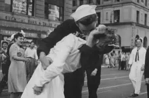 This photograph, taken by Navy photographer Victor Jorgensen, shows a sailor kissing a woman in New York City’s Times Square on “V-J Day” – Victory over Japan Day: August 14, 1945, the day Japan surrendered to end World War II. Jorgensen titled it “Kissing the War Goodbye” and it was published in The New York Times. It shows the same scene as a similar (copyrighted) photograph, “V-J Day in Times Square,” taken by photographer Alfred Eisenstaedt, that was published in Life magazine.