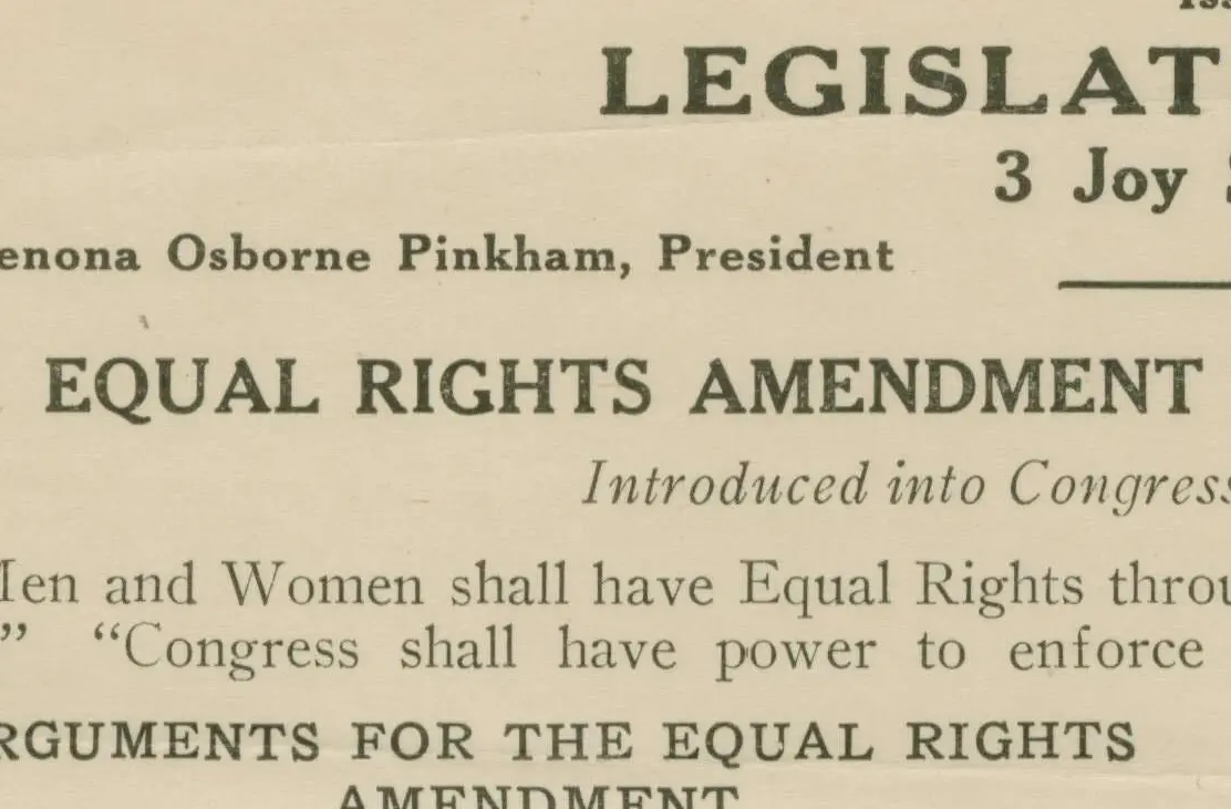This leaflet includes opposing arguments for and against the ERA. Alice Paul, vice-president of the National Woman’s Party, presents the argument in favor of the passage of the ERA. Massachusetts State Representative and Speaker of the House Benjamin Loring Young provides the argument against it.