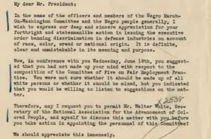An important part of banning discrimination in defense industries was how such a ban would be enforced. EO 8802 included a provision establishing a Fair Employment Practices Committee (FEPC) authorized to investigate and remedy discriminatory practices. In this letter Randolph thanked Franklin D. Roosevelt for creating the Fair Employment Practice Committee (FEPC). But he was concerned about the committee’s membership.