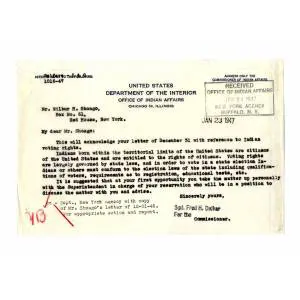 In this letter to Wilbur H. Shongo, an official at the Office of Indian Affairs responds to a question regarding the voting rights of American Indians in New York.