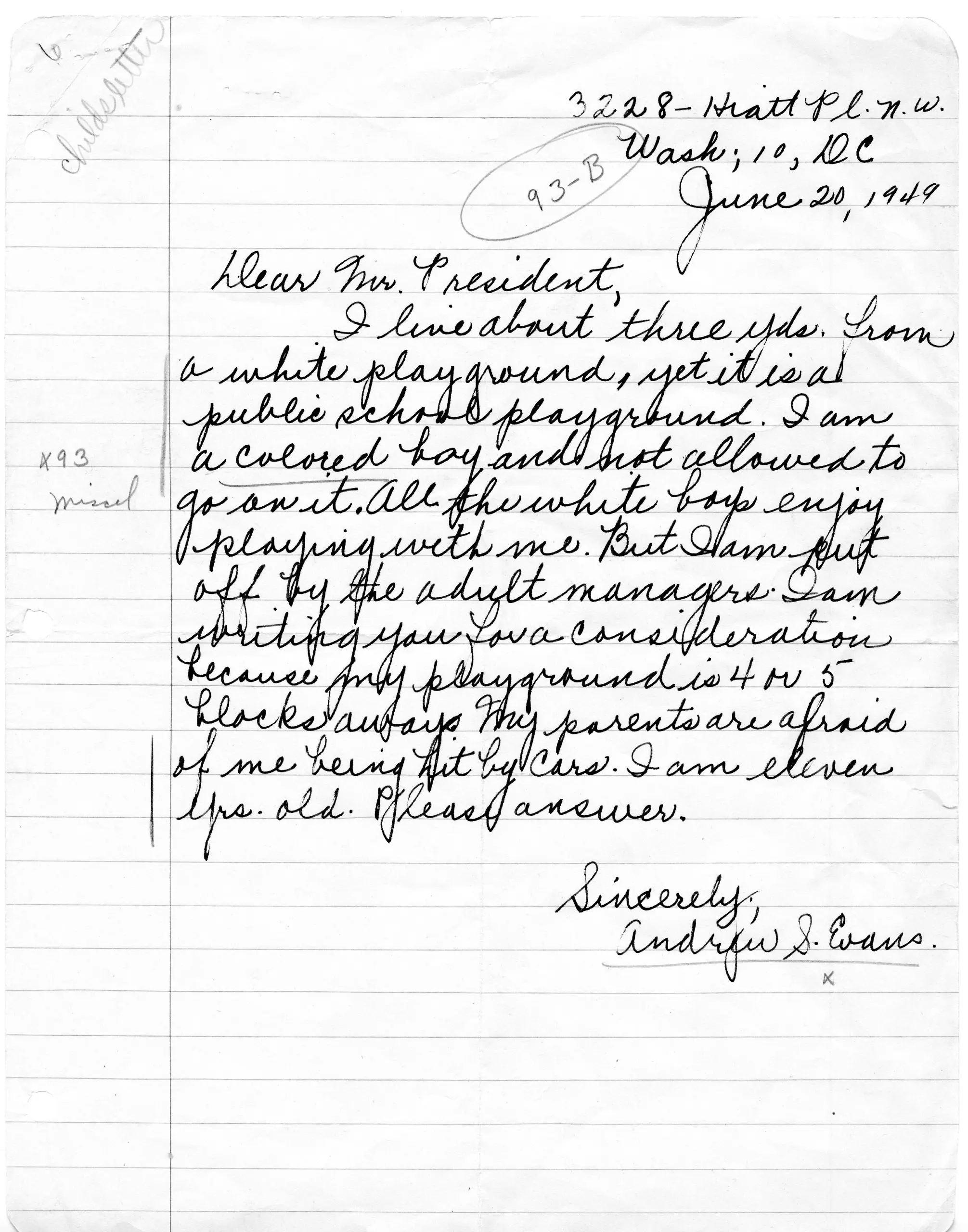 This is a letter from an eleven year old boy who lives in Washington, D. C. to President Harry S. Truman. In his letter, he asks President Truman to do something about segregated playgrounds in the city. He lives near a playground, but it is at a white public school. The white children will play with him, but the adults will not let him stay at the playground.