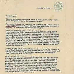 This letter is President Harry S. Truman’s response to a letter from his friend, Ernie Roberts, in which Roberts criticized Truman’s civil rights program. In his reply, Truman describes some outrageous acts of violence and discrimination against black Americans. He insists that he will continue to fight for equality of opportunity for all citizens, regardless of race, even if this results in his defeat in the upcoming presidential election.