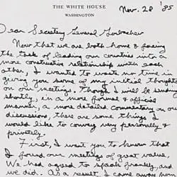 Full Citation: Letter from Ronald Reagan to Mikhail Gorbachev (English version); 11/28/1985; ID #8591239, Head of State File, Executive Secretariat, NSC; Executive Secretariat, National Security Council: Records: Head of State File, January 20, 1981–January 20, 1989; Collection RR-EXSEC: Executive Secretariat, National Security Council: Records,; Ronald Reagan Library, Simi Valley, CA. [Online Version, https://docsteach.org/document/letter-from-ronald-reagan-to-mikhail-gorbachev-english-version/, December 19, 2025]