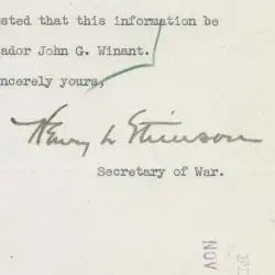 Full Citation: Letter from Secretary of War Henry L. Stimson to the Secretary of State Regarding John G. Winant, Jr.; 11/13/1943; General Records of the Department of State, Record Group 59. [Online Version, https://docsteach.org/document/letter-from-secretary-of-war-henry-l-stimson-to-the-secretary-of-state-regarding-john-g-winant-jr/, April 4, 2026]