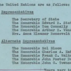 This letter lists the representatives and alternate representative of the United States of America to the first part of the First Session of the General Assembly of the United Nations. As early as 1942, leaders of the Allied countries had agreed to act as a united front against the aggression of the Axis powers. Later, at the Dumbarton Oaks Conference in August 1944, President Franklin D. Roosevelt coined the term “united nations,” which eventually became the name of the international organization envisioned by the “Big Three” Allied leaders to keep world peace. When Stalin, Churchill, and Roosevelt met at Yalta in February 1945, they agreed to meet with other friendly nations in San Francisco at the end of April to draft a charter for the new organization. Unfortunately, Roosevelt died less than two months after initial agreements were made and a mere two weeks before the conference convened. Vice President Harry Truman, largely inexperienced in international diplomacy, assumed the Presidency held so long by his predecessor and led the Nation through the diplomatic and political uncertainties that followed the end of World War II. Many people—men and women alike—thought that Franklin D. Roosevelt’s widow, Eleanor Roosevelt, would be an outstanding representative to the first meeting of the United Nations Assembly to be held in London in January 1946. She had been a spokesperson for numerous causes, including community service, civil rights, and international cooperation, during her husband’s administration. Women, especially those who had begun to assume increasingly demanding roles both at home and in the military, were particularly insistent that female candidates be seriously considered as delegates to the new United Nations. Many contended that women were predisposed by nature to seek peaceful means of resolving conflict. This letter identifies Mrs. Anna Eleanor Roosevelt as one the representatives of the United States in this international forum.