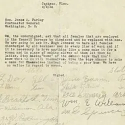 We, the undersigned, ask that all females that are employed in the Transi[en]t Bureaus be dismissed and be replaced with men. We are going to ask Mr. Hugh Johnson to have all females discharged by all business men in every line of work and if it is necessary to have anything like a camp make it for a women and in place of making slaves of them let them be ladies. Stop making “bums” of the school boys that don’t know what to do with themselves. Give the boys chance to make a name for themselves instead of being a poor bum. We have no malice in regard to women,