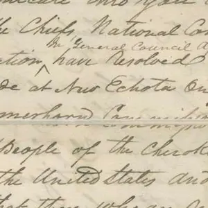 The undersigned chiefs and representatives of the Cherokee People beg leave to address you on the Commanding General, entrusted with the execution of the Order of the President of the United States, Concerning the instrument purporting to be a treaty between the United States and the Cherokee Nation East of the Mississippi; and have the honor to state, that your communication of the 19th [illegible] to the Cherokee people, [word crossed out] respecting your instruction on the subject, was promptly read [word crossed out] and interpreted to them in General Council assembled; [word crossed out] the result of this deliberation & the expression of the sentiments adopted by upwards of twenty one hundred male adults on this occasion, the undersigned would also most respectfully communicate this you to the Govt of the United States, as follows. Towit _ the Chiefs National Committee of Council and the People of the Cherokee Nation [written as an addition, “& general council assembled”] have resolved that the instrument purporting to be a treaty made at New Echota on the 29th day of the Dec. 1835 by the Rev. John F. Schermerhorn Commissioner of the United States and the Chiefs, headmen of people of the Cherokee Tribe of Indians; in a fraud upon the Govt. of the United States and an act of oppression on the Cherokee people – that those who are represented or acting on the part of the Cherokees, and who assume the style of the “Chief’s & head men” hold no such title or designation from the Cherokees, nor have they received authority from the Nation to form said instrument, Therefore said instrument is null & void and can never in justice be enforced upon the nation, as they do most solemnly disclaim and utterly reject said instrument in the principles and all its provisions.- That a respectful memorial to the govt. of the United States be prepared on behalf of the Cherokee people pray-ing that the said instrument may be set aside. That a delegation consisting of John Ross Principal Chief, Richard Taylor, Samuel Hunter, George Sanders, [illegible], John Binge, James Brown & Stephen Foreman be & are [added later] appointed with full powers to represent the Cherokee people before the Govt. of the United States, and to enter into an arguments for the final adjustment of all their existing difficulties that this delegation are instructed to confer with the Cherokees West of the Mississippi on the subject of their acting in concert for [word crossed out] the interests & happiness of the whole Cherokee family that any irresponsible individuals assuming to themselves the power to act in the name of the nation, without