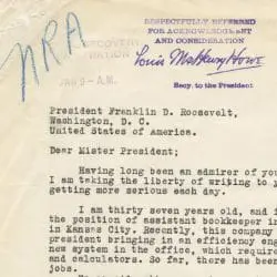 This letter typifies several hundred letters sent to the National Recovery Administration that complain about the employment of married women whose husbands are also employed. Writers, like Miss Kubicki, used adjectives such as “greedy” to describe married women who “cheat” their single sisters and drain the lean job market. Miss Kubicki is typical of working women of her time because single women (divorced and widowed) were 71 percent of the female labor force, although women were only 21 percent of the total labor force in 1930. Although Miss Kubicki wrote to President Roosevelt, her letter was referred to the correspondence branch of the NRA for reply. That reply was sympathetic, but not altogether reassuring. it urged her to write members of Congress and suggested that increased public criticism on the subject of working/married women might result in “some action” in the current session of Congress; yet it informed her firmly “…the authority vested int his administration by the National Industrial Recovery Act does not permit us to intervene in matters of this type and the government cannot say just whom a certain firm shall or shall not employ.” While uncertain about Miss Kubicki’s employment future, we do know that, as a federal policy, the government never ruled against hiring married women, although some state regulations and popular sentiment were generally opposed to married women working at that time.