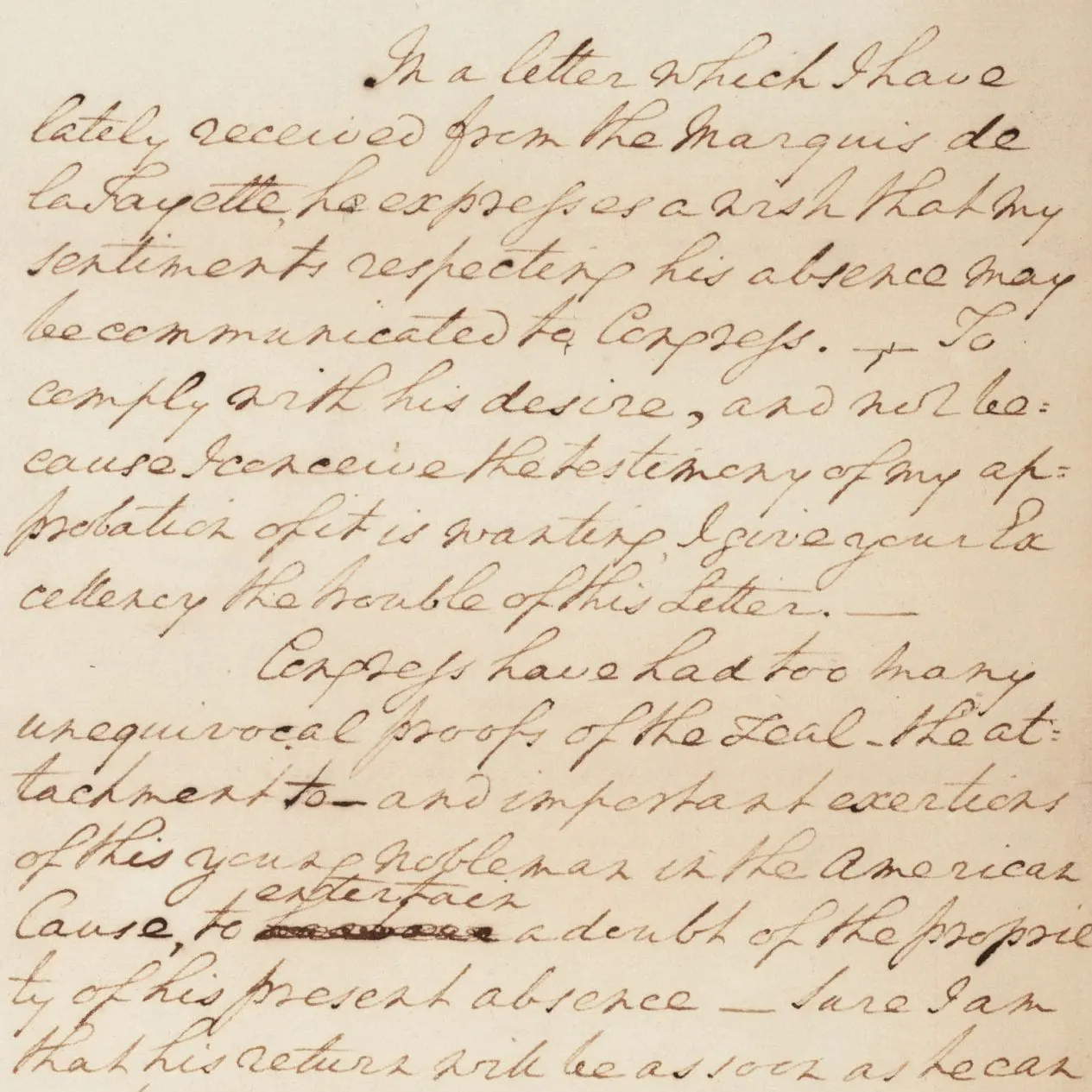 While at the Newburgh (NY) cantonment, General George Washington corresponded with the Marquis de Lafayette. Lafayette was on leave from the army working in Europe to represent American interests. In a letter dated December 4, 1782, Lafayette asked Washington to “favorably endorse his conduct” in writing to Congress. Washington complied with Lafayette’s request in this letter, dated March 23, 1783. Shortly thereafter Congress passed a resolution of approval and thanks for Lafayette’s services.