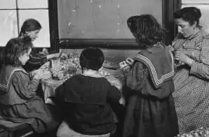 The original caption for this photograph is “Leveroni family. Earns 4 [cents] a gross making violets. Can make 20 gross a day when children all work. Father has work. Mrs. Leveroni, Tessi, age 9, Stephen, age 6, Margaret, age 7, Josephine Cordono, age 10. These children work on Saturdays, on afternoons after 3 o’clock, and evenings until 8 or 9. New York.”