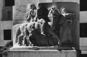 The relief sculpture depicts Meriwether Lewis and William Clark on horses being led by Sacagawea. Inscribed on the base is “Westward the Star of Empire Takes its Way.”