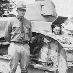This is a photograph of Lieutenant Colonel Dwight D. Eisenhower standing in front of a tank at Fort Meade, Maryland. Eisenhower, a 28-year-old officer grown bored with his peacetime posting at Fort Meade, was one of the army observers on a 1919 Transcontinental Motor Convoy that toured the country along the Lincoln Highway, from Washington, DC, to San Francisco, California.