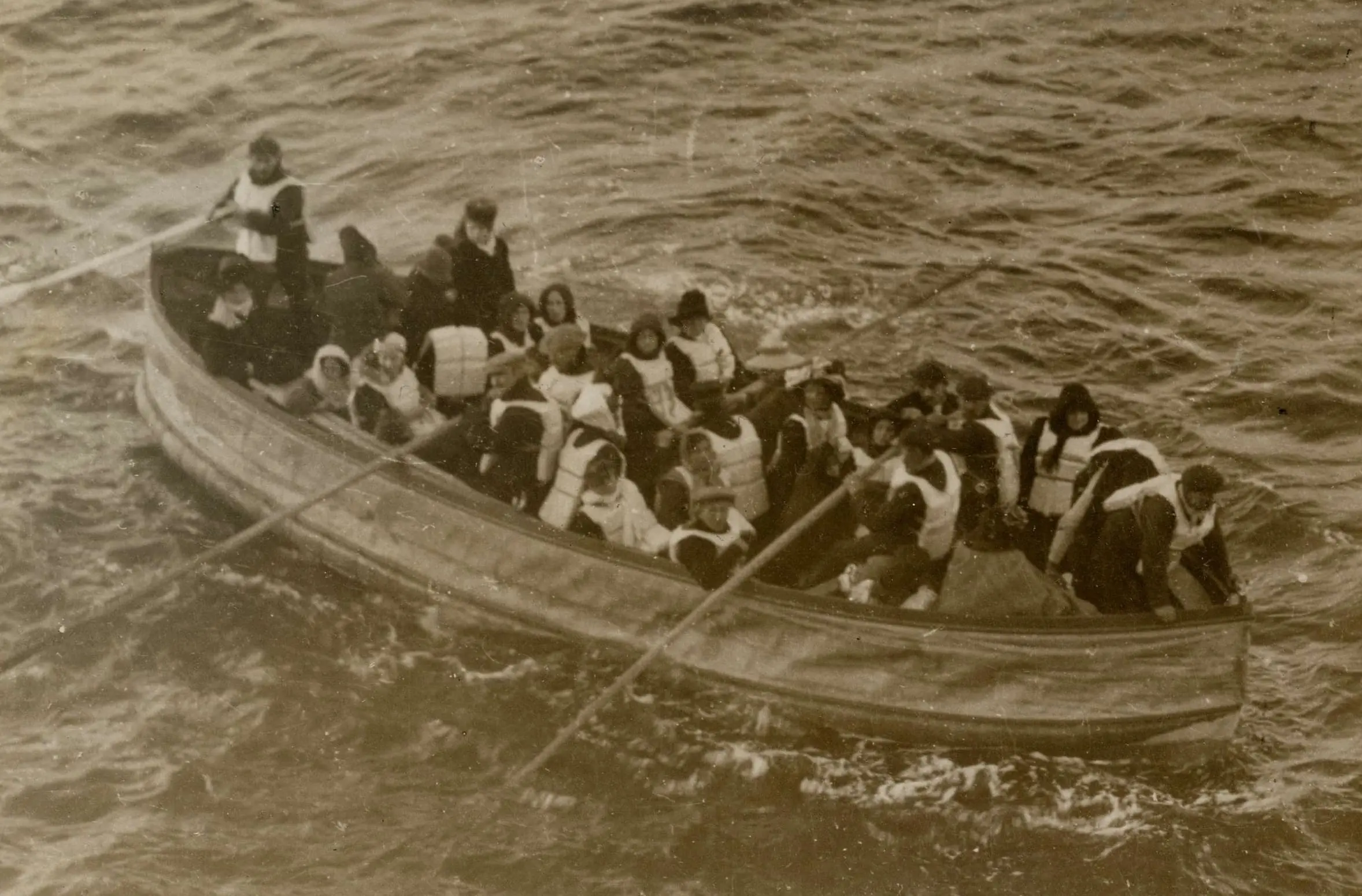 After colliding with an iceberg in the North Atlantic Ocean, R.M.S. Titanic sank on April 15, 1912. The Titanic only had enough lifeboats to carry 1,178 of the 2,225 passengers and crew to safety. Here a group floats to safety aboard a lifeboat. The original caption reads: Photograph of a lifeboat carrying TITANIC survivors. The following partial caption appears on the back of the fractured mat: “…H.B. Harris, Geo. Thinis (?), Mr. and Mrs. J. Milton (?), H.B. Staffanson (?), H. Woolman (?), Nairatil (?) children, Mys. Compton in stern – transferred from No. 14.” The writing on this mat is faded and difficult to read.