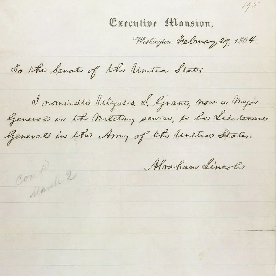 With this message, President Abraham Lincoln forwarded Major General Ulysses S. Grant’s name to the U.S. Senate for consideration for promotion to the rank of lieutenant general on February 29, 1864. Congress had recently authorized the rank, held previously only by George Washington.