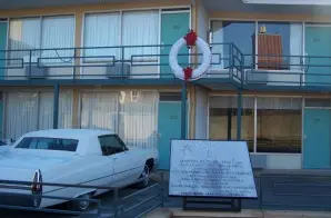 This photograph shows a wreath on the balcony of the Lorraine Motel, marking the spot where Dr. Martin Luther King, Jr., was shot and killed on April 4th, 1968. The motel has been preserved as part of the National Civil Rights Museum.