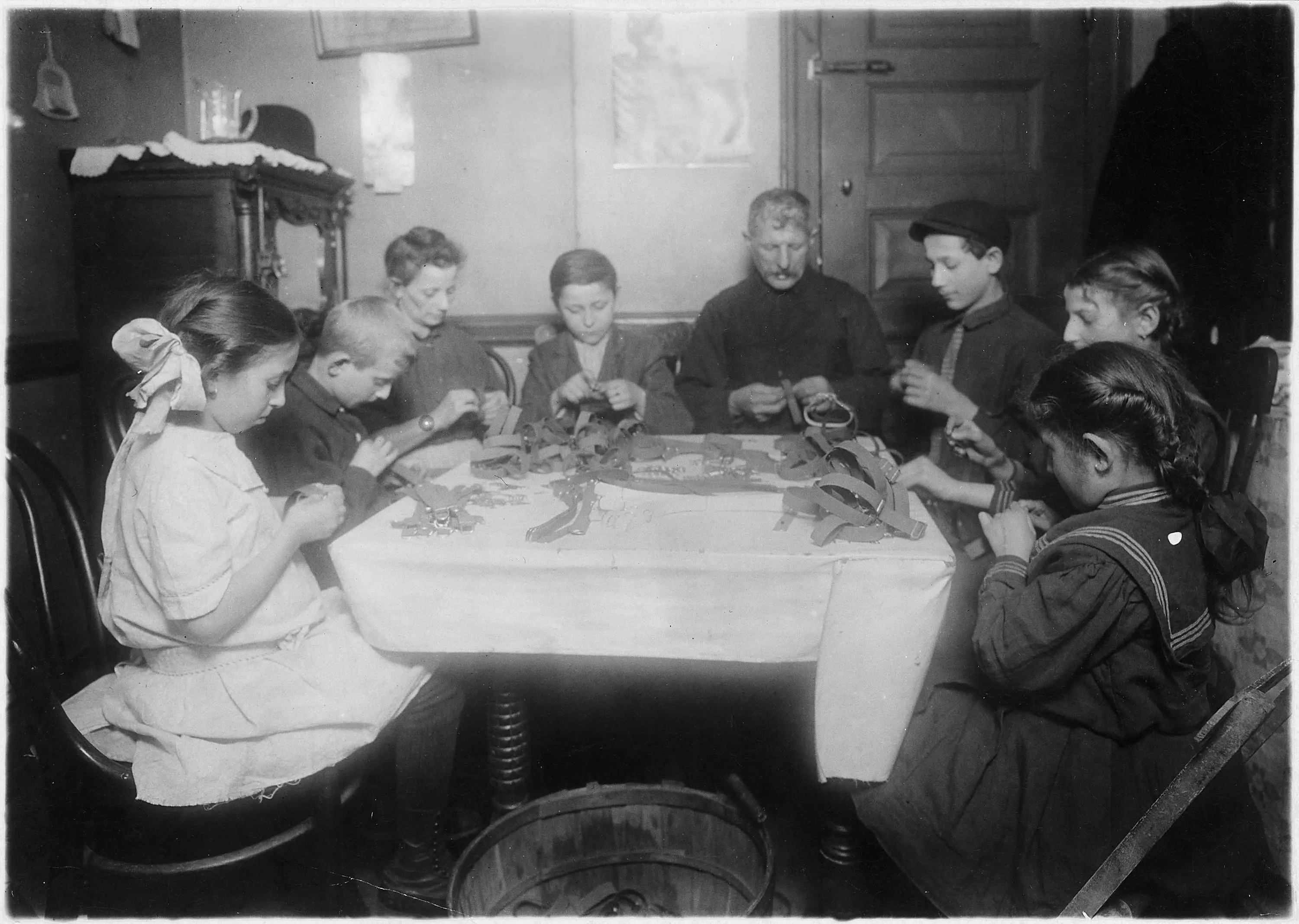 Original Caption: Making garters (armlets). A Jewish family and neighbors working until late at night. This happens several nights in the week when there is plenty of work. The youngest work until 9 P.M. The other until 11 P.M. or later. 7 year old Sarah, next is 11 year old sister, 13 year old brother. On left is 7 year old Mary and 10 year old Sam, and next to the mother is 12 year old boy. The last three are neighbors’ children. Father is out of work and helps make garters. New York City.