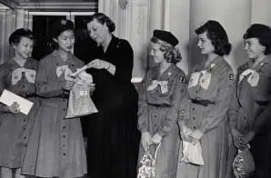 Full Citation: Photograph 72-722-1; Mamie D. Eisenhower Meets with Girl Scouts from Marion, South Carolina, Outside the White House; 3/9/1954; White House Albums, 1953 – 1961; Records of the National Park Service, Record Group 79; Dwight D. Eisenhower Library, Abilene, KS. [Online Version, https://docsteach.org/document/mamie-eisenhower-girl-scouts/, December 12, 2025]