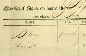 This manifest (a list of passengers or cargo aboard a ship) shows two enslaved women named Betsey and Harriet who were being transported from New Orleans to Philadelphia in 1821.