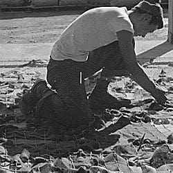 The full caption for this photograph reads: Manzanar Relocation Center, Manzanar, California. Making camouflage nets for the War Department. This is one of several War and Navy Department projects carried on by persons of Japanese ancestry in relocation centers.