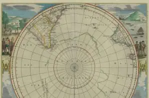 In the background of the illustration in the bottom right cover of the atlas page, natives can be seen hunting a penguin with a spear. A large penguin also stands next to a person in the foreground. Penguins, which are also found at the southern tips of South American and Africa, are pretty accurately depicted, although perhaps a little large. However, “sea lions,” which must have been much less familiar to European publishers, appear as African lions frolicking in the shallow sea water rather than the flippered marine mammals that we are familiar with today.