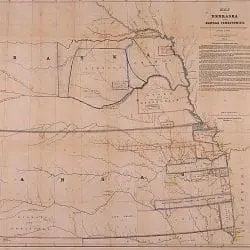 Full Citation: Map of Nebraska and Kansas Territories, showing the location of the Indian Reserves according to the treaties of 1854; 1854; Presidential Messages to the Senate in the 35th Congress Transmitting Treaties and Other Papers Pertaining to Relations with the Pawnee Indians; Records Relating to Treaties with Indian Tribes, 1789 – 1871; Records of the U.S. Senate, Record Group 46; National Archives Building, Washington, DC. [Online Version, https://docsteach.org/document/map-nebraska-kansas/, December 23, 2025]