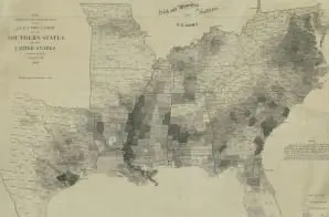 The map shows the percentage of enslaved people by county, with different colors reflecting the percentage. It provides a visual picture of how enslaved persons were distributed across the Southern States.