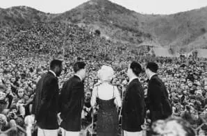 The original caption for this photograph reads: Marilyn Monroe sings several songs for an estimated 13,000 men of the First Marine Division. Miss Monroe stopped at the First Marine Regiment on her tour of the military units in Korea.