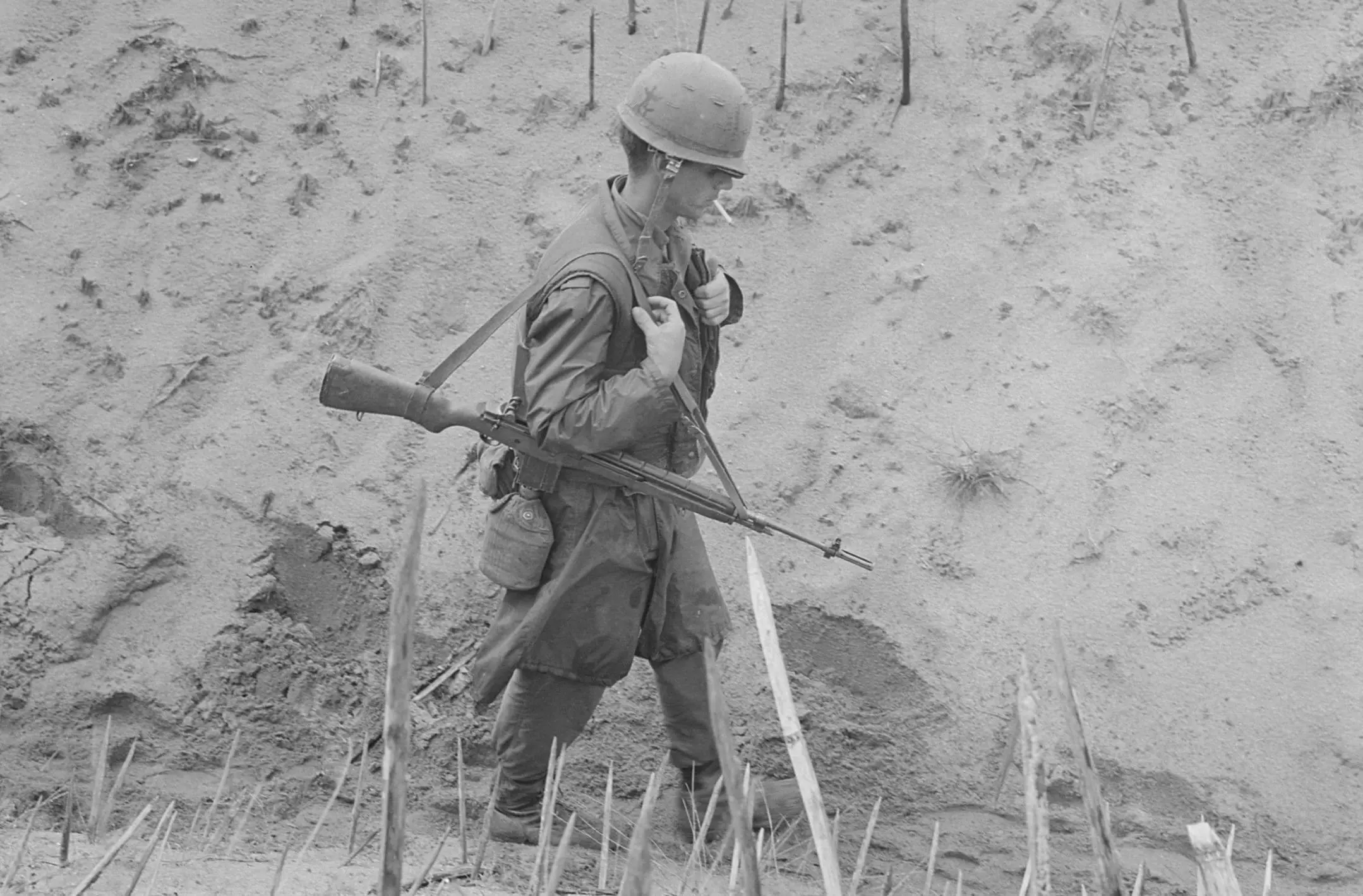 The original caption for this photograph reads: Vietnam….Marines of Company H, 2nd Battalion, 4th Regiment, walk through a punji-staked gully.