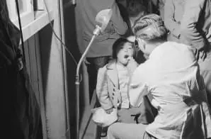 The original caption for this photograph reads: Poston, Arizona. Evacuees of Japanese ancestry are given preliminary medical examinations upon arrival at War Relocation Authority centers where they will spend the duration.